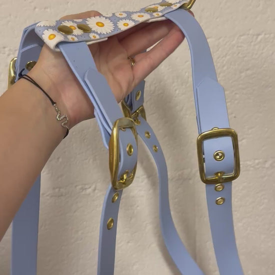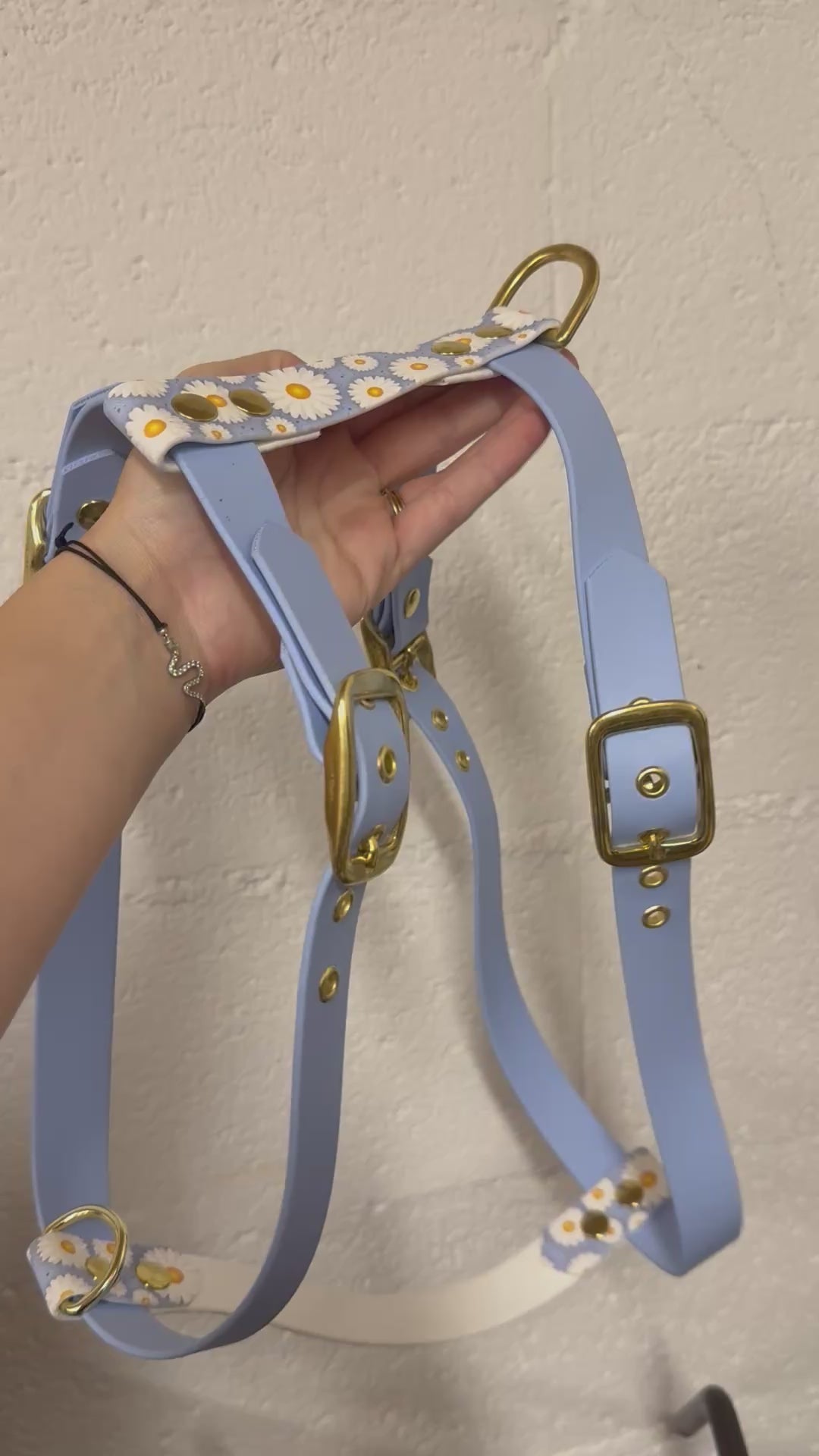 largeur 25mm, bouclerie or, biothane polar & biothane impression UV « Daisy » dispo sur demande + option anneau anti-traction